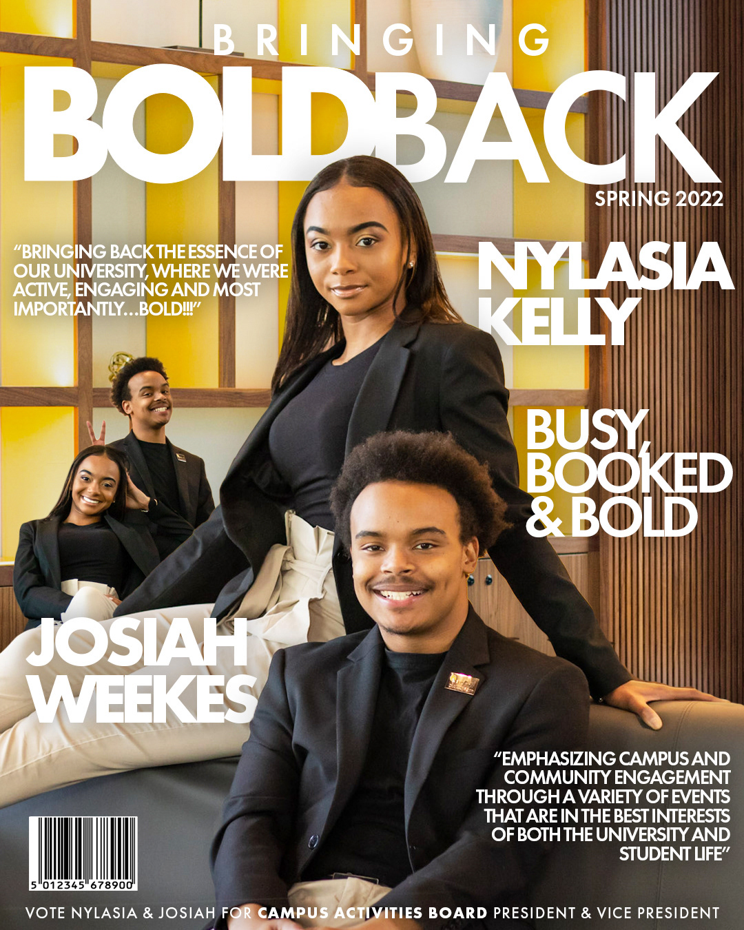 Nylasia Kelly & Josiah Weekes were a new client of JKM. Nylasia tasked me with the creative direction of photography and simple, stunning design of campaign materials. This campaign was all about "Bringing Bold Back" to ignite the excitement of what campus was and what it could be with Nylasia as Campus Activities Board President. We strategized on content, including 2 static designs. We pushed for excitement, school pride, and professionalism. We were looking to communicate "all about business to bring fun".